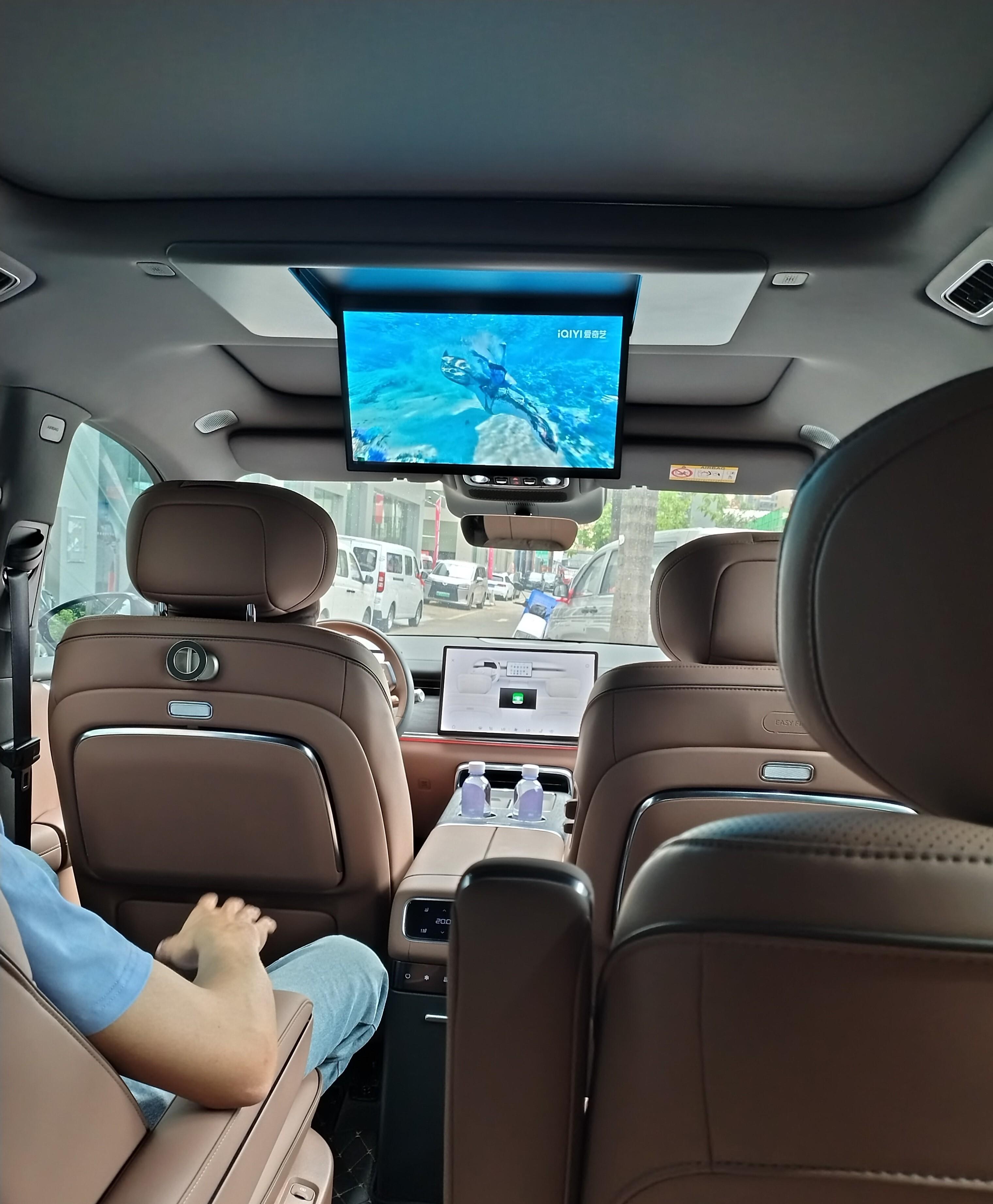 D19的内饰配置单也确实能打:木纹饰板、皮质触感柔软、缝线细腻,第二排有120°零重力座椅,腿托升起、靠背后仰。车内有三块屏:60英寸AR-HUD、17.3英寸中控屏、21.4英寸后排娱乐屏,还有双折叠小桌板、8.1L冷暖冰箱,甚至带车载制氧机,最大制氧量8L/min。