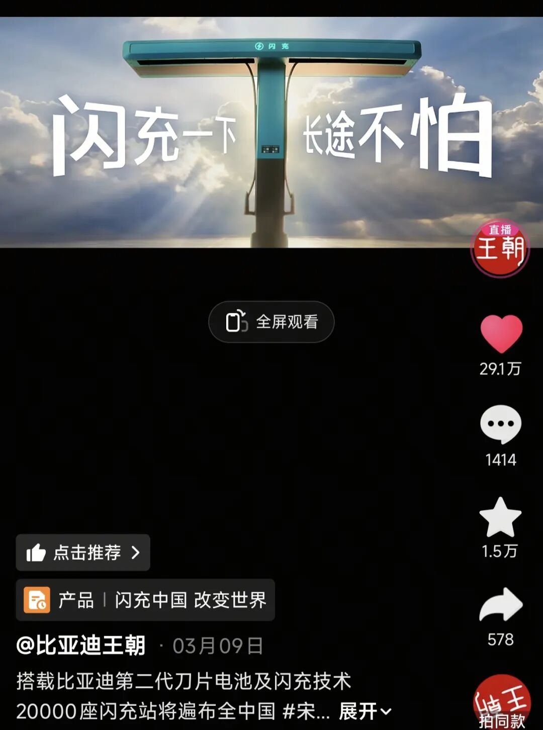 比亚迪王朝的视频瞄准新能源用户最核心的两大焦虑:安全与补能,是典型的“技术向+场景化”爆款逻辑。以第二代刀片电池为核心卖点,锚定用户对电池安全的深层顾虑,同时搭配20000座闪充站的落地数据,用“技术+基建”双维度打消补能焦虑,用硬核技术+落地成果建立品牌信任。