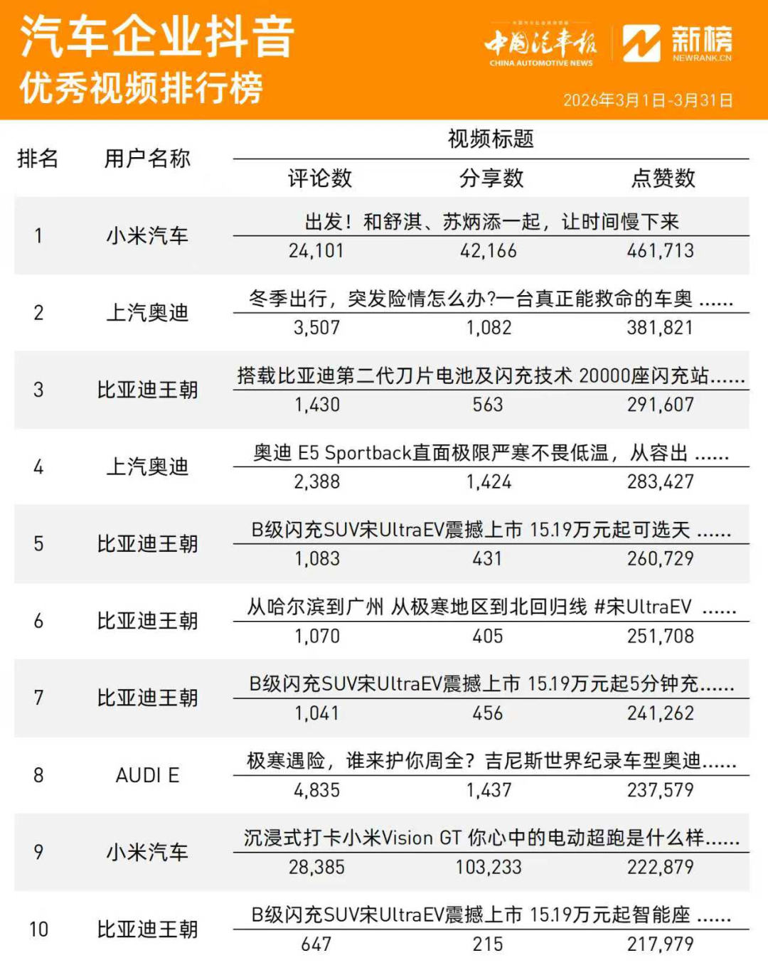 3月,“汽车企业抖音优秀视频排行榜”中,小米汽车两条优秀视频上榜,并以其中一条夺得榜首;上汽奥迪与AUDI E共有3条优秀视频上榜;比亚迪王朝拿下5个席位。