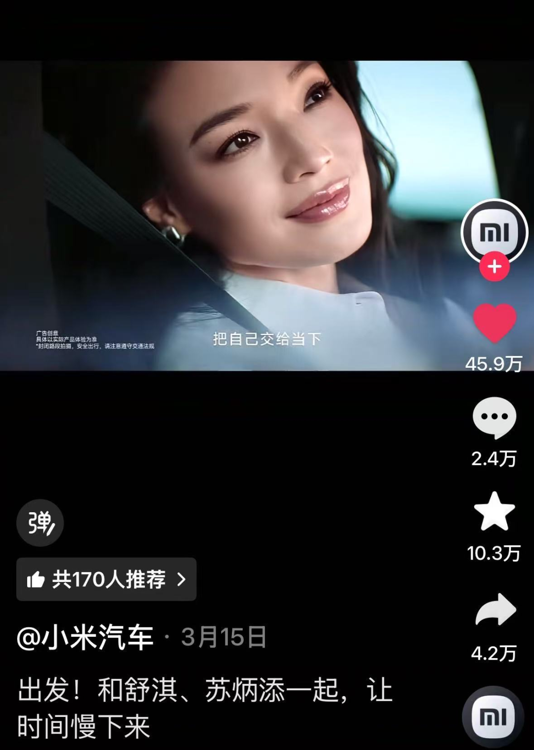3月发布的舒淇相关系列视频,是小米汽车账号数据爆发的核心引擎之一。这波内容的爆火,本质是小米汽车对网友诉求的积极响应。此前网友在评论区反复喊话“请舒淇代言小米汽车”,品牌没有忽视用户声音,而是快速落地合作,用“网友让请就请”的真诚态度,回应了当下消费者对车企“接地气、听民意”的情感需求,打破了传统车企高高在上的营销姿态,让网友从“消费者”变成“共创者”,自然催生了高热度的二次传播。