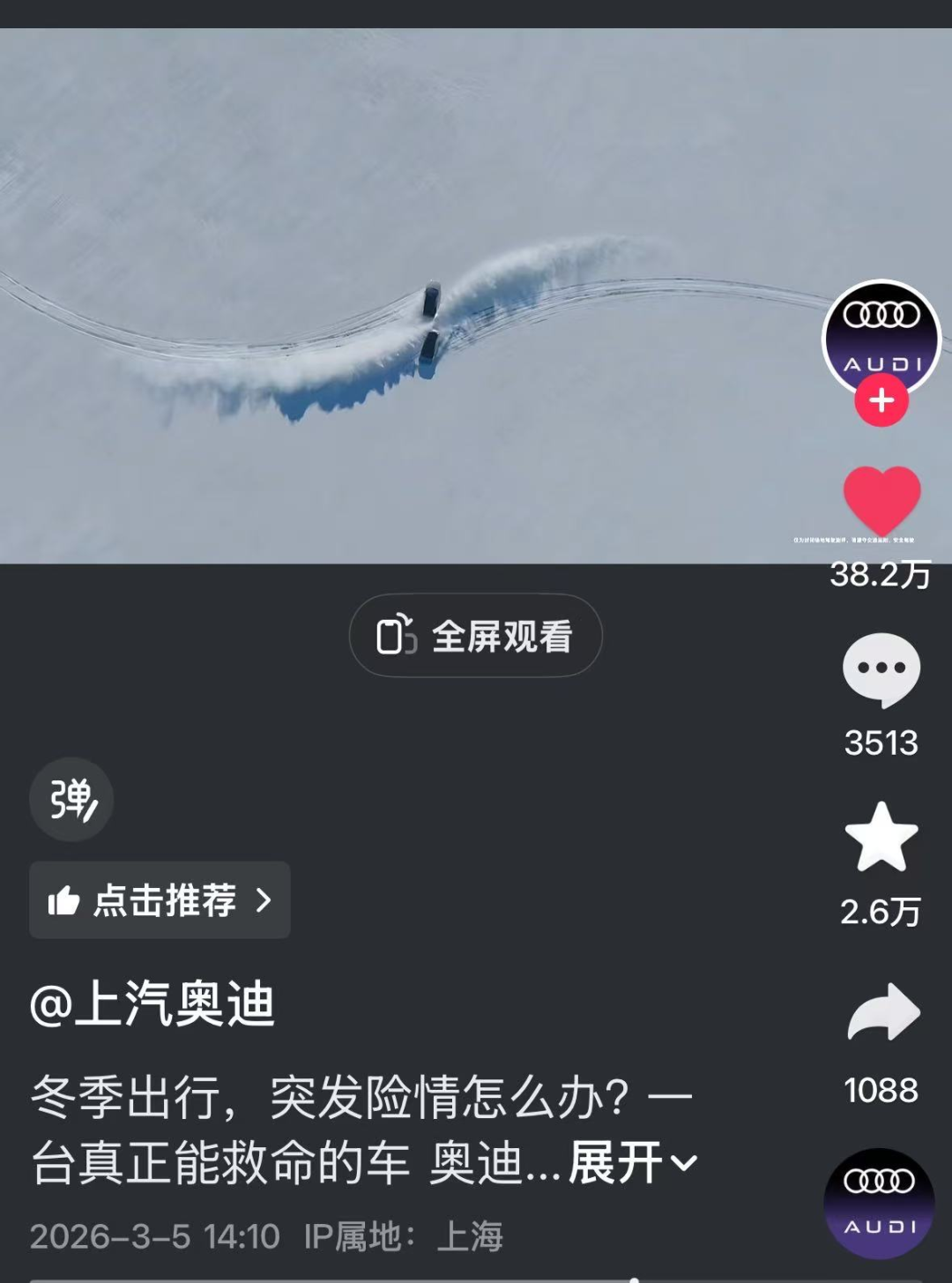 “好的操控可以在危急时刻救你一命。”上汽奥迪3月的优秀视频以挑战吉尼斯世界记录的形式、刺激的视听语言,展示出奥迪的技术自信。真正能救命的车,不仅能在极寒条件下顺利充电、行驶,过雪堆、跨冰裂,还能够合作画出一幅书法作品。上汽奥迪在15万平方米的雪地上,用10多辆车完成了一副书法作品——“马上有HORSE(好事)”,并把这份祝福送给屏幕前的每一位观众。上汽奥迪这条视频区别于常规的产品卖点宣传,用“救命”这个强情绪、强价值的关键词,瞬间抓住观众注意力。