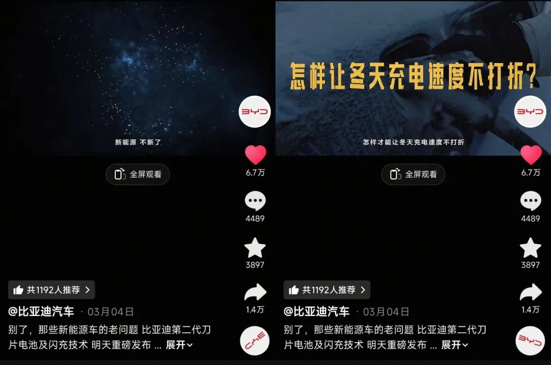 3月,第二代刀片电池及闪充技术是比亚迪汽车抖音账号的营销重点。一句“新能源,不新了”,足以让刷短视频的人停下手指、继续观看。新能源早已是生活里常见的老朋友,但这位老朋友也留下很多困扰我们的老问题。什么时候充电和加油一样快?怎样让冬天充电速度不打折?还要多久假日充电才不用排长队?充电的枪和线能不能轻一点?在2分多钟的视频里,比亚迪汽车快速回顾新能源的历史,并直面新能源汽车一直以来被诟病的问题,最后抛出一句“暴论”——别了,新能源车的老问题!这条预热视频为比亚迪第二代刀片电池暨闪充技术的发布,做足了铺垫,烘托出一种划时代的氛围。在新技术发布会后,比亚迪汽车账号又陆续更新了多条实测视频,如零下20℃充电实测、电池热扩散试验、电池底部撞击试验等,让新技术的传播热度持续发酵,最大化传播效果。