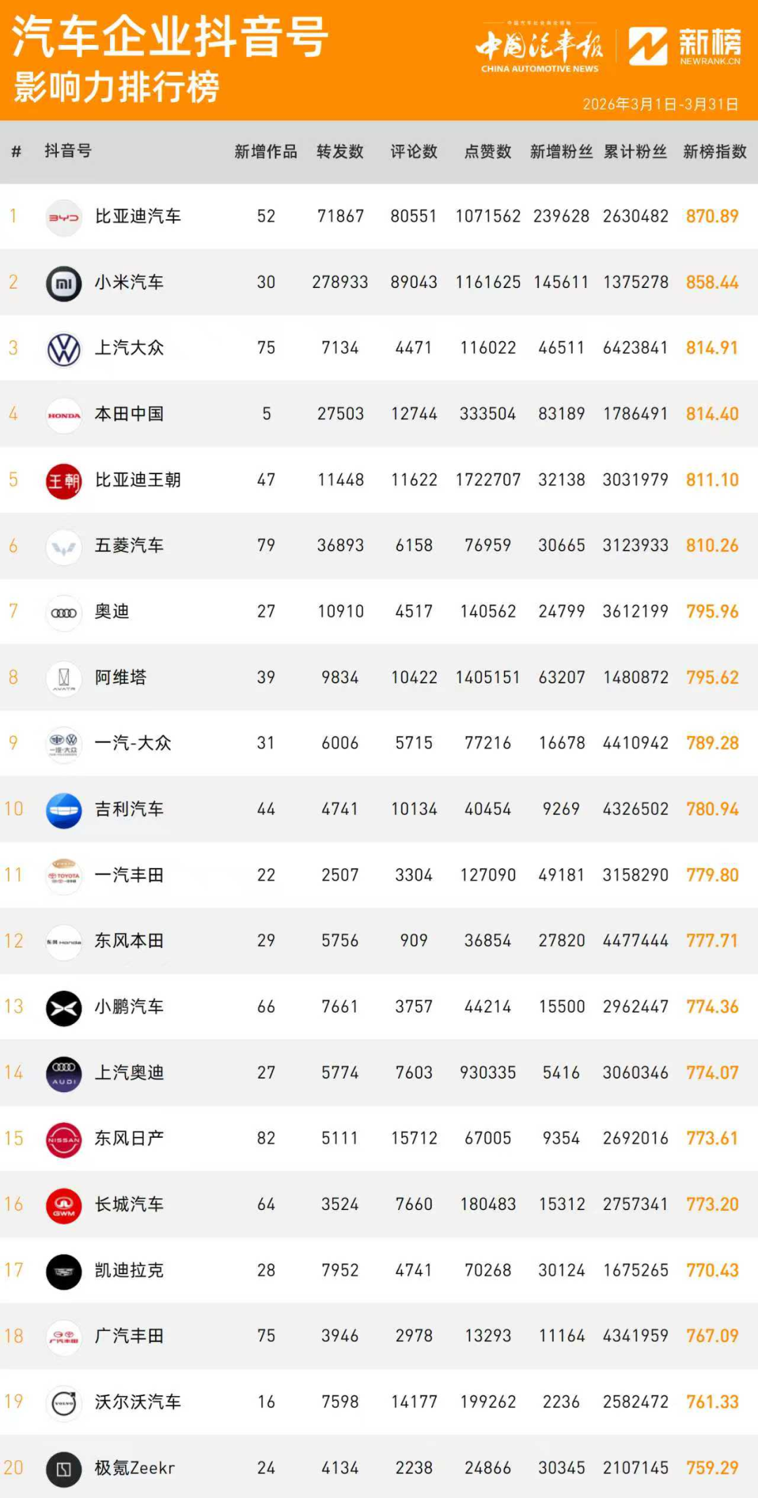 3月,汽车企业抖音号影响力前20强的神秘面纱即刻揭开。
