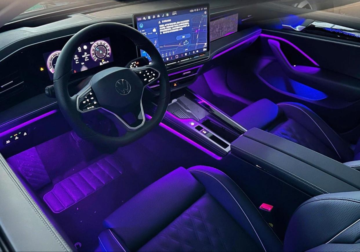 大灯组内部的灯带与前格栅氛围灯带无缝衔接,贯穿式的设计瞬间拉宽了车头的视觉效果,点亮后,科技感满满,夜晚辨识度极高。中央可发光的大众品牌标识,更是画龙点睛之笔,不仅提升了整车的科技氛围,还让大众的品牌形象更加深入人心,开在路上,别人一眼就能认出这是迈腾。