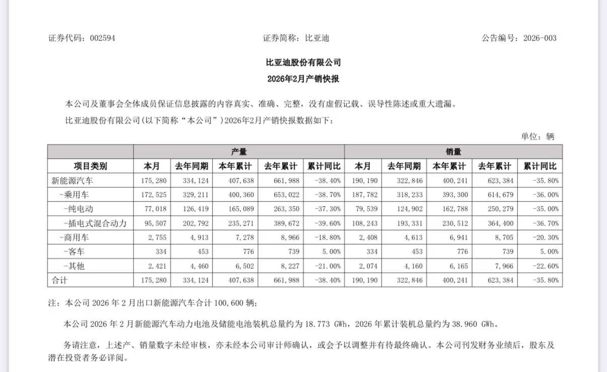 比亚迪:2月新能源车销量190,190辆 金融界 发布时间:2026-03-01 21:29 | 北京富华创新科技发展有限责任公司官方账号,优质财经领域创作者 3月1日,比亚迪公告称2026年2月实现新能源汽车销量190,190辆;2月出口新能源汽车达100,600辆。2月新能源汽车动力电池及储能电池装机总量约为18.773GWh。 0 全部评论 (0) 暂无评论 热门推荐 起步静如处子,换胎贵如割肉!新能源车轮胎为何如此短命? 老孟汽车 新车|指导价8.99万元起/中大型MPV,新款东风风行菱智PLUS上市 汽车速览社 01:11 冲床气垫的工作原理 Jason音匠 花一万块,你买到的可能只是一台125风冷小踏板,但大阳告诉你,这笔钱现在能拿下水冷四气门+ABS+TCS的全能座驾! 严哥说好车 17年卡罗拉1.2T自动丐版落地12.3万,行驶24万公里油耗仅6.7L,维护成本低故障率小,车主使用体验依旧满意 雾里闲谈 贵州汽车修复的工具 北京圣手汽车装饰服务有限公司 01:39 奥迪a6前杠错位最简单三个处理方法 李玉儿聊车_AI分身 加载中...
