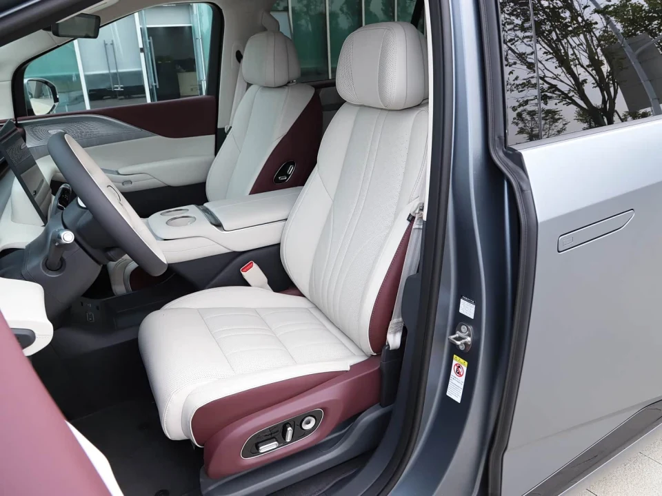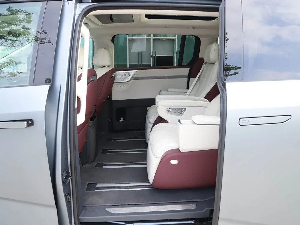 全系标配Nappa真皮座椅,二排零重力座椅带安全气囊,可180度躺平 。中央过道宽度180mm,进出第三排不费劲 。10.8L冷热冰箱、五温区空调、21.4英寸后排娱乐屏,把“移动的家”这事做到位了 。
