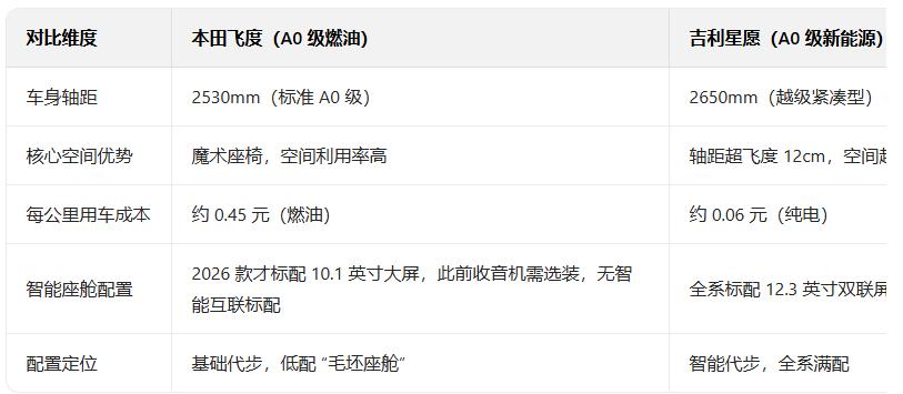 如今这些国产车的优势太明显了:吉利星愿明明是和飞度同级别的A0级车,轴距却做到了2650mm,比飞度长了12厘米,空间直接越级;比亚迪海鸥每公里用车成本才几分钱,对比飞度每公里四毛多的油费,简直是碾压。