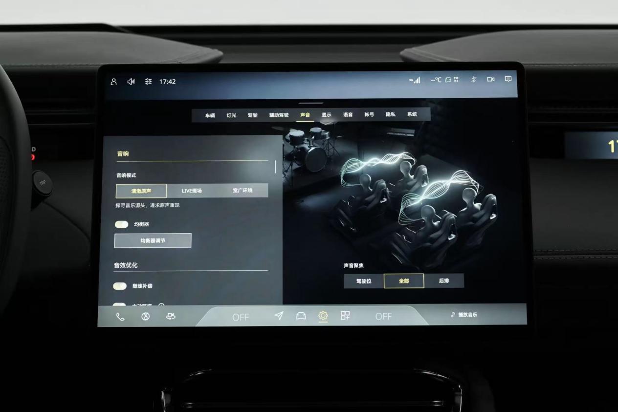 莲花没有跟风堆满屏幕,也没有走性能车“毛坯房”的路线,简洁的座舱布局顺手好操作,触手可及的地方都是高品质材质包裹,豪华感不刻意,却处处可见。重点说两个大家关心的点:一是23扬声器KEF殿堂级音响,
