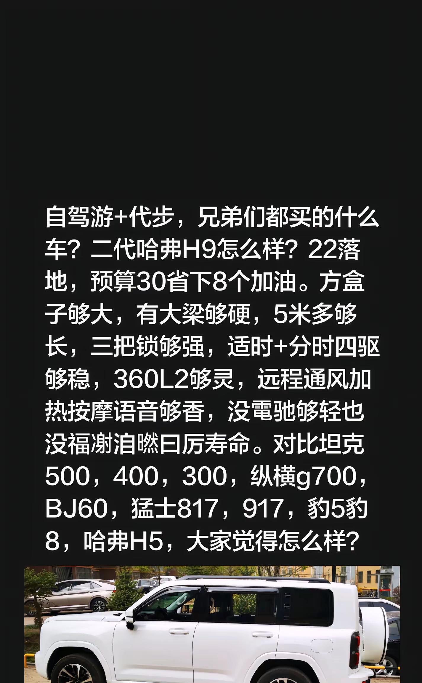 群里有个兄弟上周刚提了车,在朋友圈晒了张方向盘照片,配文写着“自驾游+代步,已定哈弗H9,不是穿越版不是勇士版,是白雪公主版,22落地,预算30省下8个加油”。底下评论区直接炸了,有人竖大拇指说会过日子,也有人阴阳怪气说“省下的钱加油?怕是加油都不够”。我好奇点进去看了看,这兄弟选的是汽油版,落地价22万,比预算30万省了整整8万块。他掰着指头算账:方盒子够大,有大梁够硬,5米多够长,三把锁够强,适时+分时四驱够稳,360和L2够灵,远程通风加热按摩语音够香,最后还补了一句“没电池够轻也没那些电池焦虑”。说实话,这套配置单念出来,别说他,换谁都得心动一下。