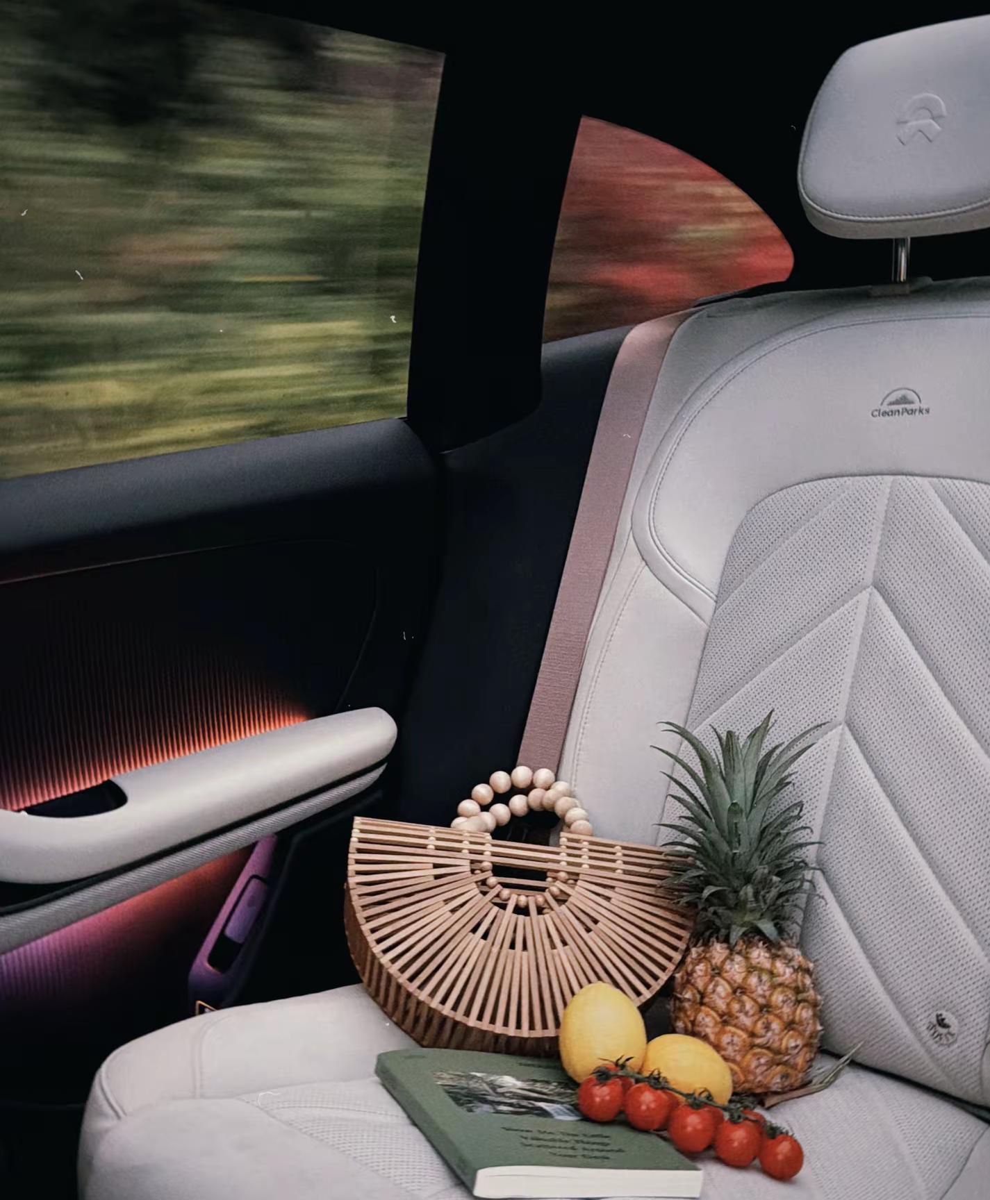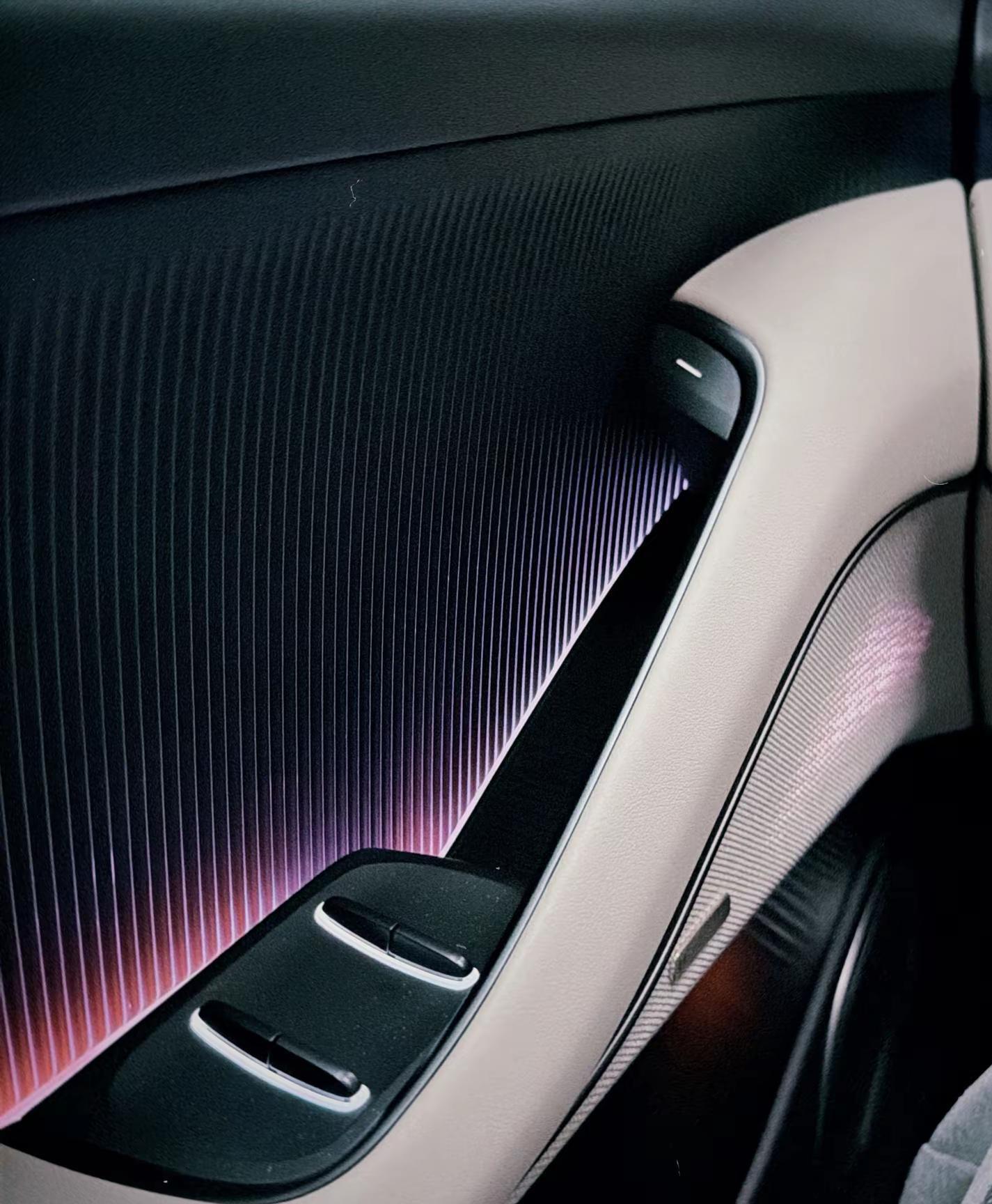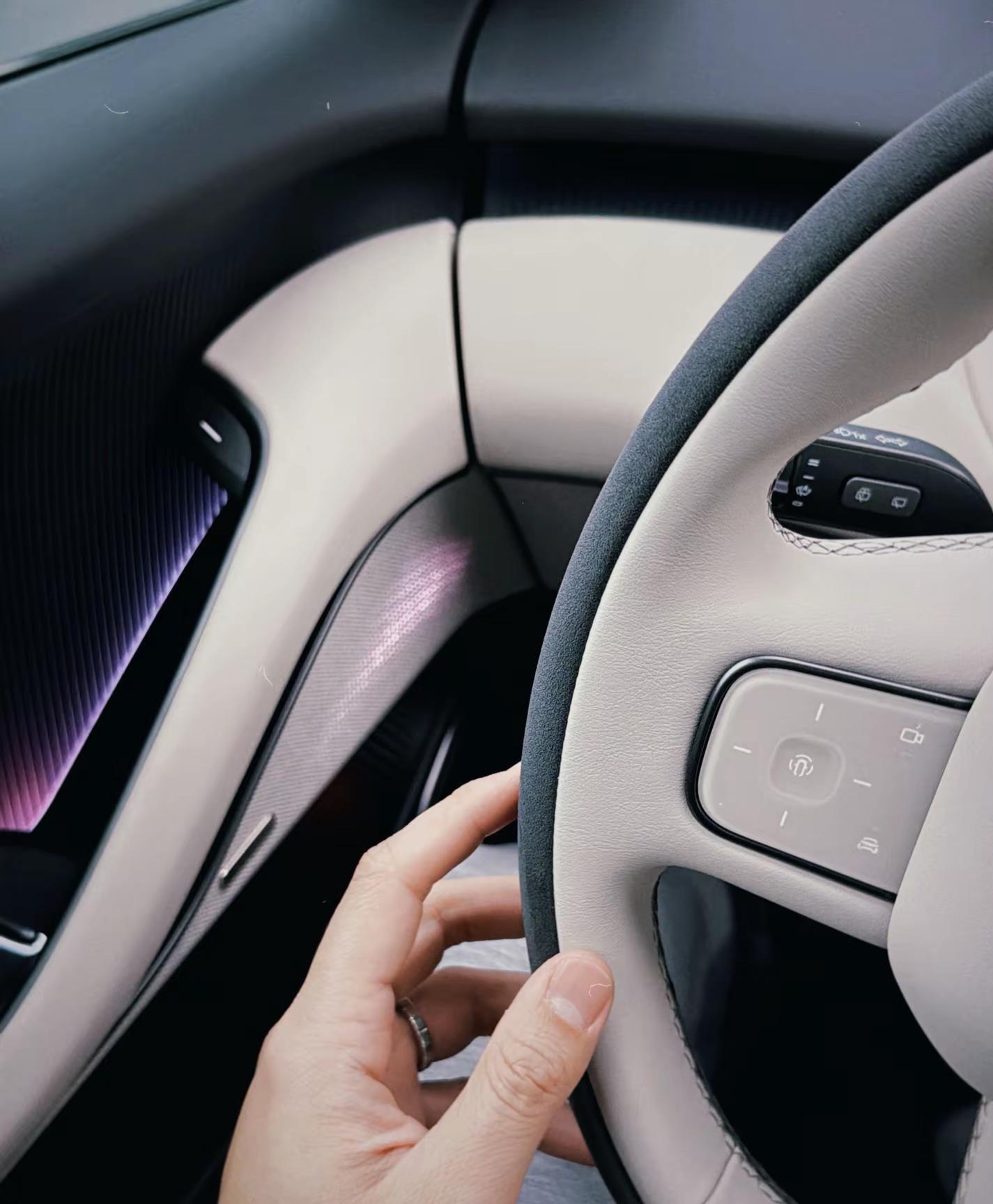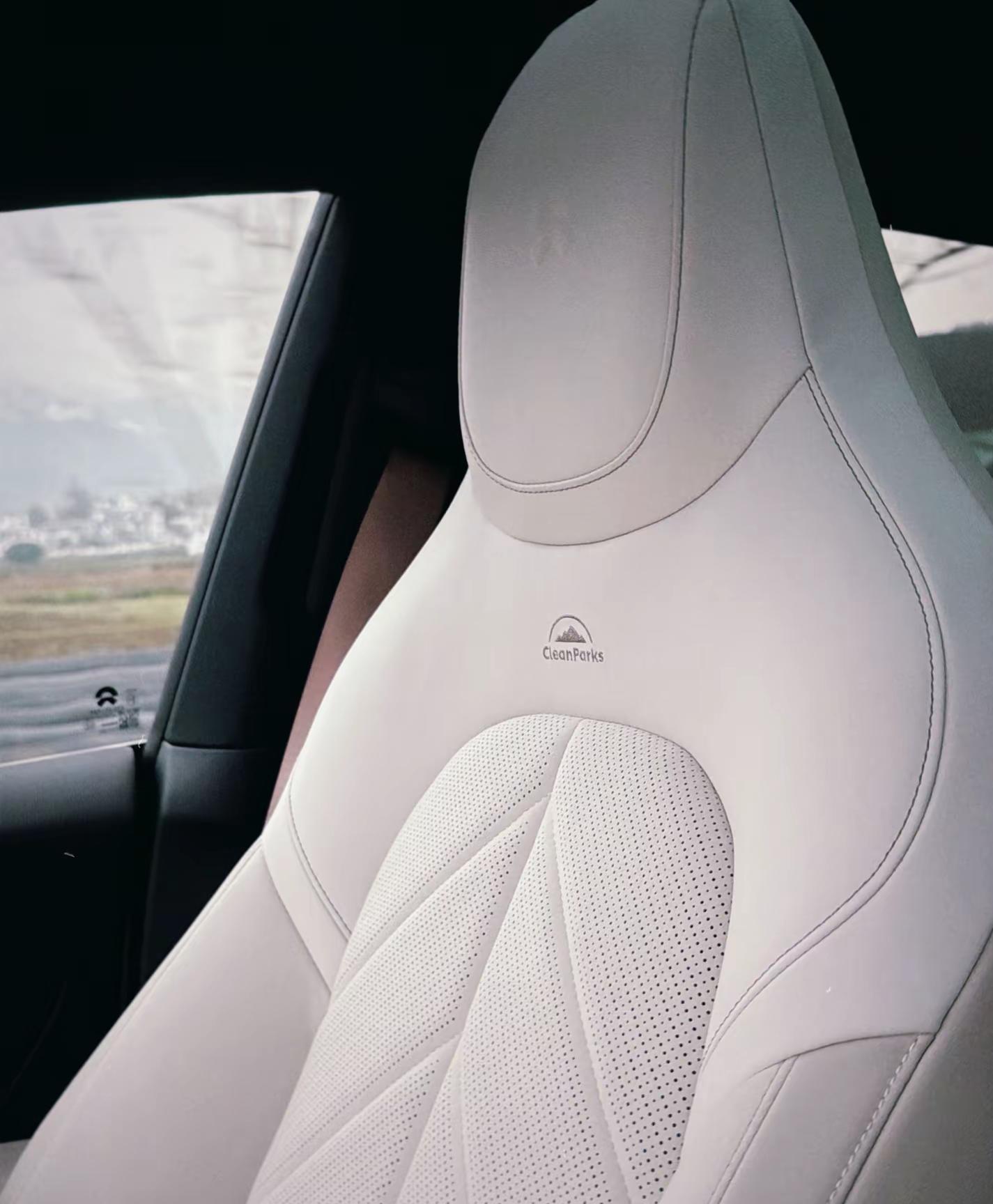 麂皮座椅是什么概念?摸上去那种细腻的阻尼感,坐上去那种恰到好处的摩擦力,跟普通皮革完全是两个物种。而且麂皮的哑光质感,视觉上比亮面皮革高级了不止一个档次。有人可能会问:麂皮好打理吗?说实话,深色的确实比浅色耐脏,但这套白内用的是浅色麂皮,蔚来官方做了特殊的防污处理,日常清洁用湿布擦一下就完事了。