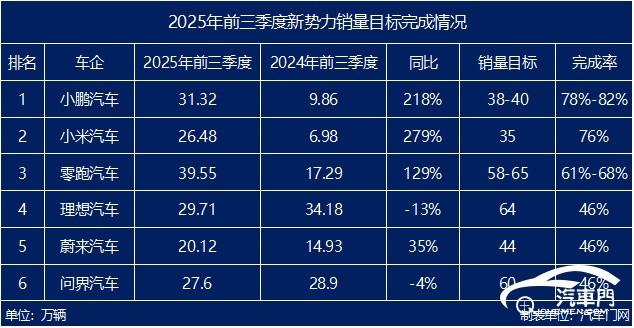 随着前三季度汽车销量数据的公布,各家新势力2025年销量KPI的完成进度逐渐清晰。从数据上来看,头部阵营的竞争不仅愈发激烈,各家新势力在年目标完成率上更呈现出显著分化的态势。