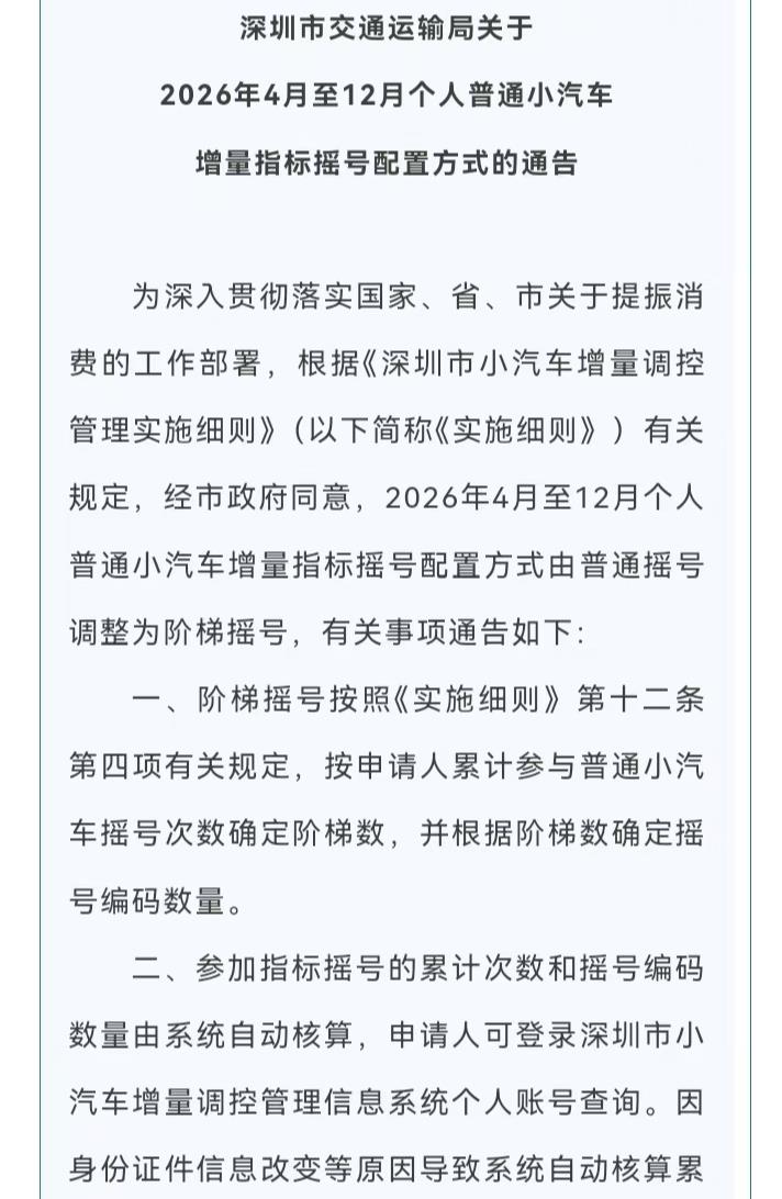 别再以为这个月还是跟以前一样拼运气了。深圳市交通运输局4月3日发布通告,2026年4月至12月,个人普通小汽车增量指标摇号配置方式由普通摇号调整为阶梯摇号。这可不是什么小修小补,这是直接改了游戏规则。
