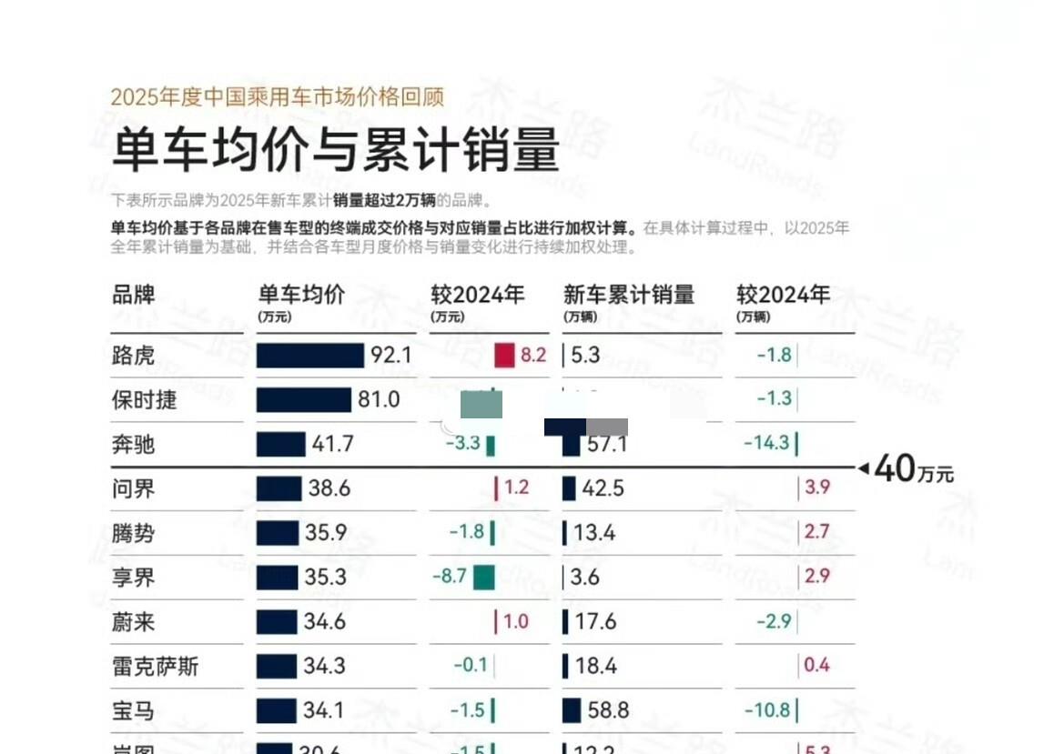 那么,用这把尺子去量2025年的车市,会量出个什么结果呢?根据乘联会等机构公布的2025年全年数据,能同时过这两关的品牌,两只手就数得过来。无非就是奔驰、宝马、奥迪这些传统豪强,再加上特斯拉,以及理想、蔚来、问界、腾势这几个冲得最猛的国产新能源品牌。像一些销量虽然不错,但均价主要在30万以下的品牌,比如比亚迪的王朝/海洋网、大众、丰田的主力车型,就被筛掉了。而一些均价奇高,但年销量远不到2万的品牌,比如法拉利、兰博基尼,甚至保时捷(2025年中国市场销量约9.2万辆)和路虎,在“主流高端”这个讨论范畴里,也被暂时放在一边了。这么一过滤,战场瞬间清晰了。