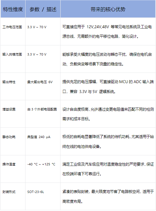 2. 灵活增益配置:通过3个外部电阻即可精确调整测量灵敏度,适应不同电流范围(毫安级至数十安培级),灵活性大
