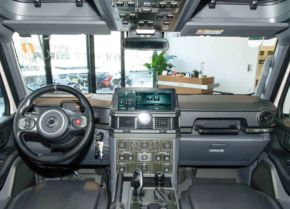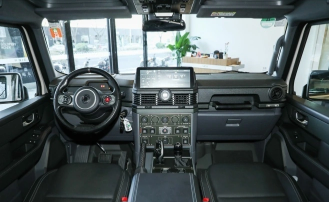 配置上,它采用封闭式梯形车架底盘,全时四轮驱动+手动双速分动箱,五连杆前后悬架搭配艾巴赫刚度递增螺旋弹簧,悬架上下行程超585毫米,接近角、离去角表现出色,极端路况下也能牢牢抓地,越野实力不输路虎卫士110。内饰延续复古简约风格,搭配高品质材质,旋钮和开关设计精致,兼顾复古质感与基础舒适性,没有多余的花哨配置,却处处彰显质感。