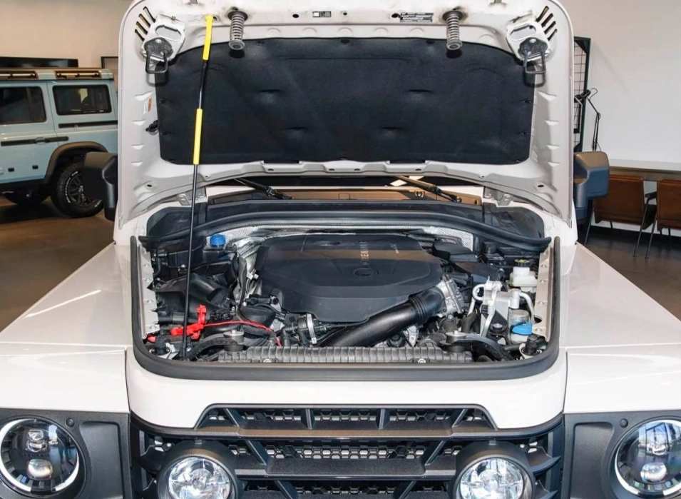 配置和动力这块,这台限量版越野的实力一点不弱,复古不代表落后。动力上,它搭载源自宝马的3.0T涡轮增压直列六缸汽油发动机,搭配采埃孚8速自动变速箱和重型扭矩转换器,动力输出平顺强劲,比路虎卫士110的3.0T动力更沉稳,越野时爆发力十足。