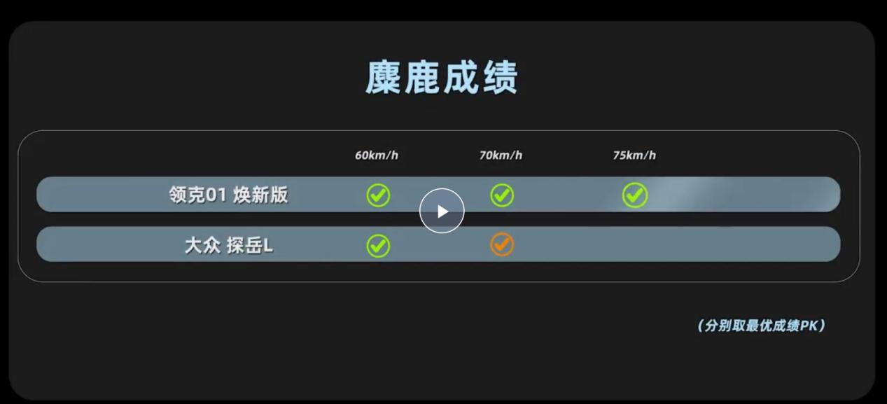 底盘悬架部分采用的是同级别常见的前麦弗逊后多连杆独立悬架,不过调校的舒适稳健,支撑性高,在媒体做的麋鹿测试中对上大众探岳L,最终领克01凭借精准的指向和底盘支撑性,完成了75公里/小时的测试,而探岳L的底盘调的稍软,B区转C区时出现打滑,完成了70公里/小时的测试,相比之下,领克01的操控性要好一些。