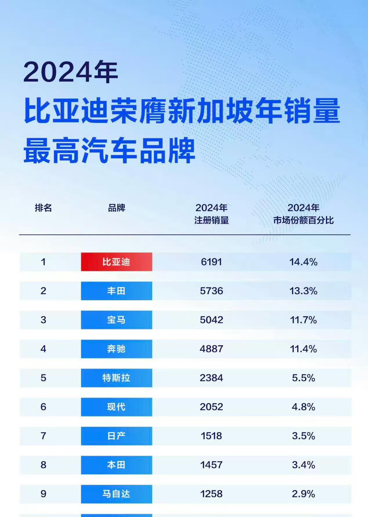 先看乘用车这边,数据漂亮得不像话。新加坡陆路交通管理局把账算得明明白白,2025年全年,比亚迪卖了11184台乘用车,比2024年的6191台翻了快一倍,同比增长80.6%。这还不算完,市占率直接干到了21.2%。什么意思?就是新加坡大街上每开过去5台新车,至少有1台挂的是比亚迪的标。丰田、宝马这些老牌劲旅全被甩在身后,比亚迪是当地唯一一个年销量破万的车企。你要知道,比亚迪2022年才正式进新加坡乘用车市场,两年登顶,三年把差距拉成断档,这速度够不够吓人?