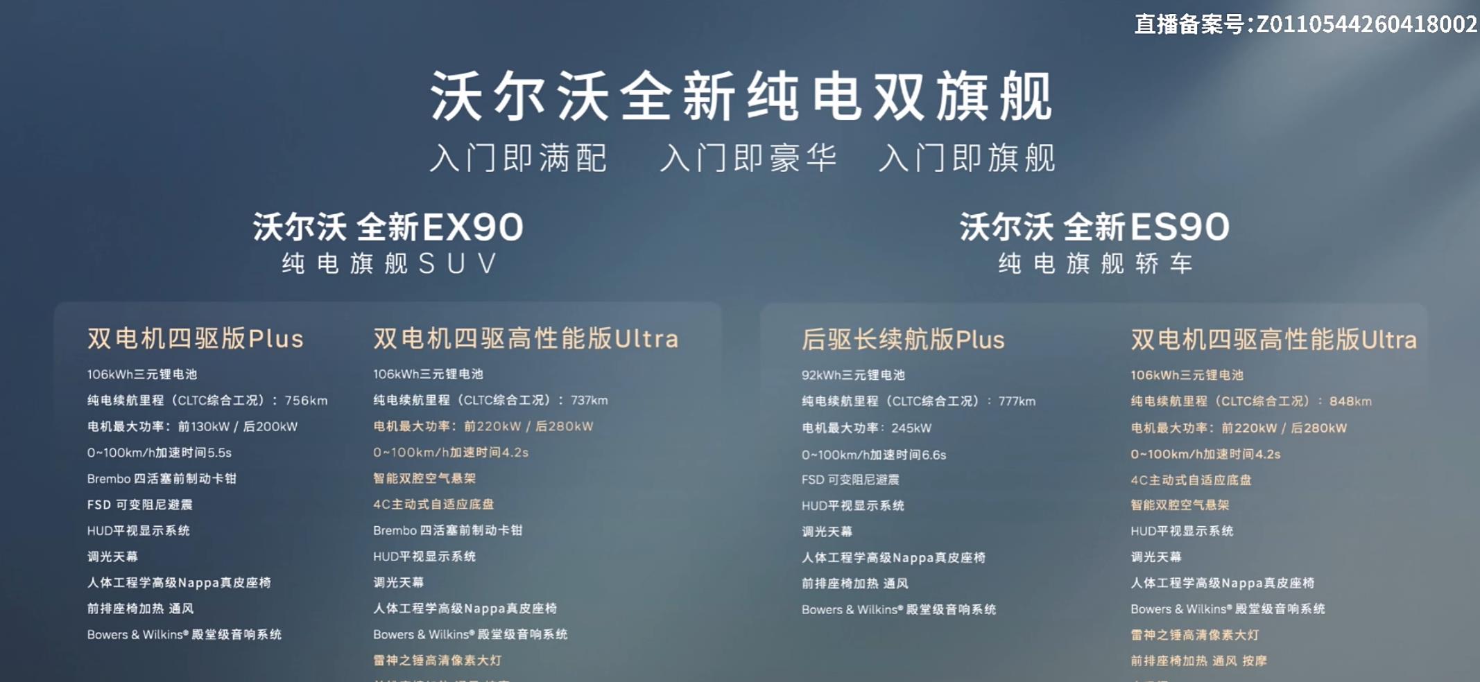 沃尔沃EX90,中大型纯电SUV,双电机四驱Plus版53.99万,双电机四驱高性能Ultra版60.99万。沃尔沃ES90,中大型纯电轿车,后驱长续航Plus版42.99万,双电机四驱高性能Ultra版49.99万。