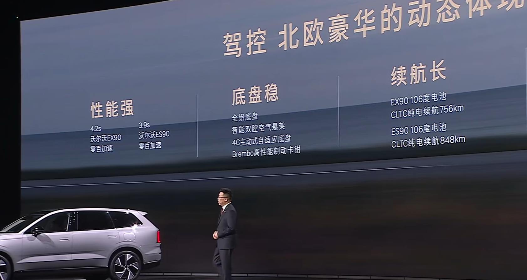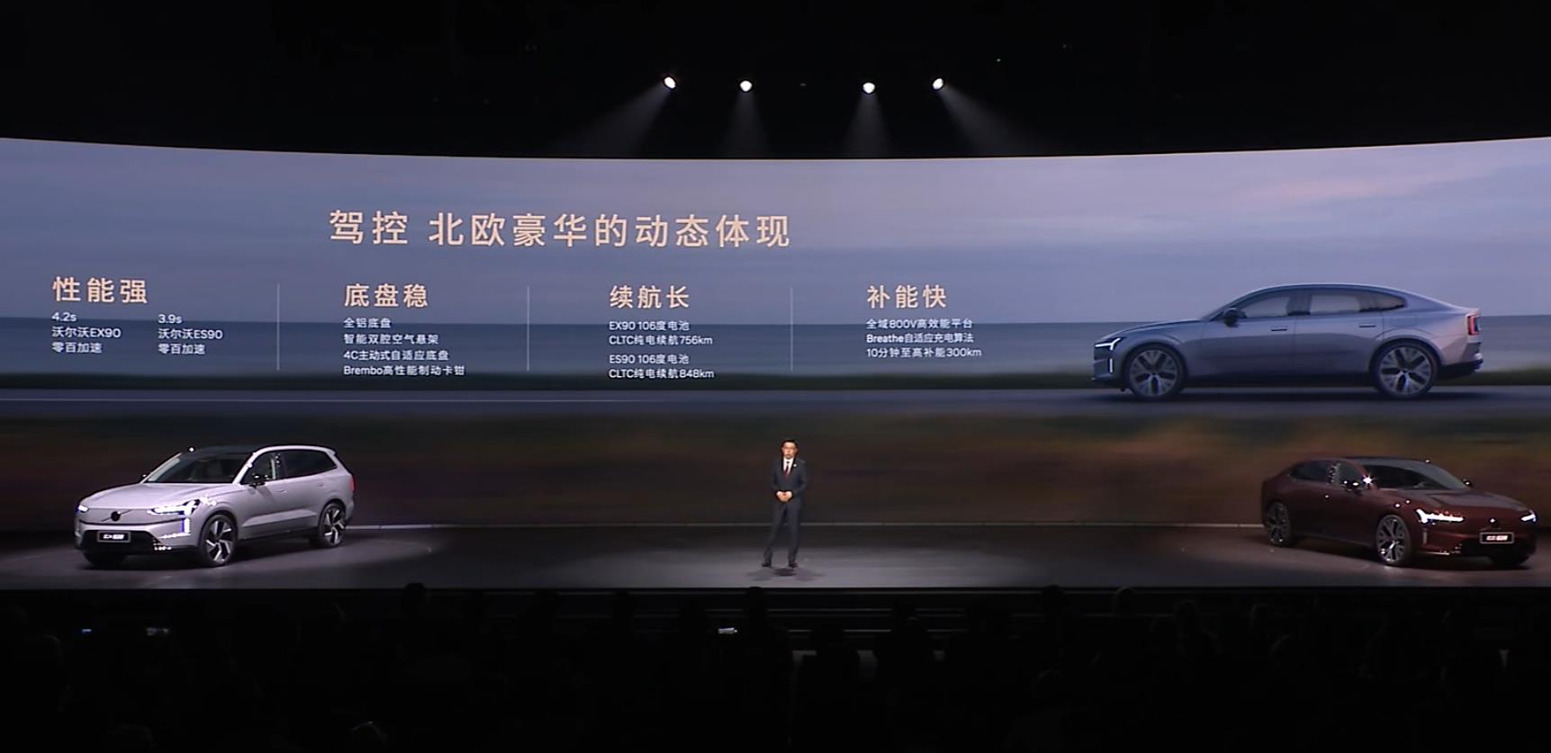 全系标配800V高压平台。ES90后驱版续航777公里,双电机版续航848公里。EX90双电机版续航756公里。这个数据放在2026年的市场上,不算最顶,但绝对是第一梯队。关键是沃尔沃的续航不虚标,这是欧洲车一贯的特点,标的多少你基本能开到多少,不像有些品牌CLTC打个七折才真实。