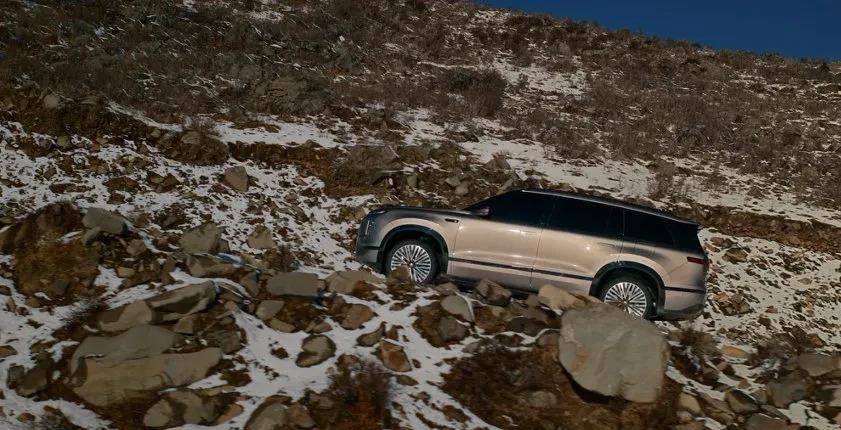 而且它还配了双腔空气悬挂,能软能硬,还能上下升降150mm。有个场景特别实用,就是它有个“一键调平”功能。有时候在户外露营,或者去乡下停在坑洼路边,车身歪歪扭扭的,在车里睡觉都往下滑。这车能自动感应坡度,把四个轮子的悬挂调整到不同高度,把车身给你整平了,这在SUV里绝对是稀罕配置。