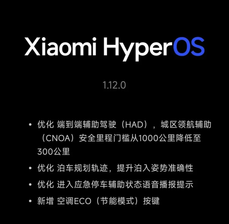 咱们具体看这次升级,它解决的都是些“痒点”,但挠得挺准。比如,把开通城市领航辅助(CNOA)的资格门槛,从安全行驶1000公里直接降到300公里。这对新手司机或者刚提车的朋友太友好了,能更快用上核心功能。再比如,优化了城市路况下的车道选择和横向控制,让自动驾驶更像“老司机”;优化了泊车轨迹,停得更准了;甚至新增了空调ECO节能模式一键开关。这些细节都在说明一件事:小米的团队在认真收集用户反馈,并且有能力通过云端,持续地打磨和优化你的车。这就像你买了个智能手机,它隔段时间就给你带来新功能和更流畅的体验,这种“常用常新”的感觉,是很多传统燃油车给不了的。
