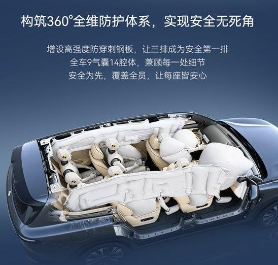 为了这个结果,它在你看不见的地方下了血本。全球首发的一体式热成形前地板骨架,配合那身钢筋铁骨,连第三排座椅背后都加了防穿刺钢板。气囊更是夸张,全车配了9个气囊14个腔体,有个从A柱一直拉到D柱、长达2.6米的侧气帘,能在翻滚中持续保压6秒钟,把三排座的所有人头都护住。