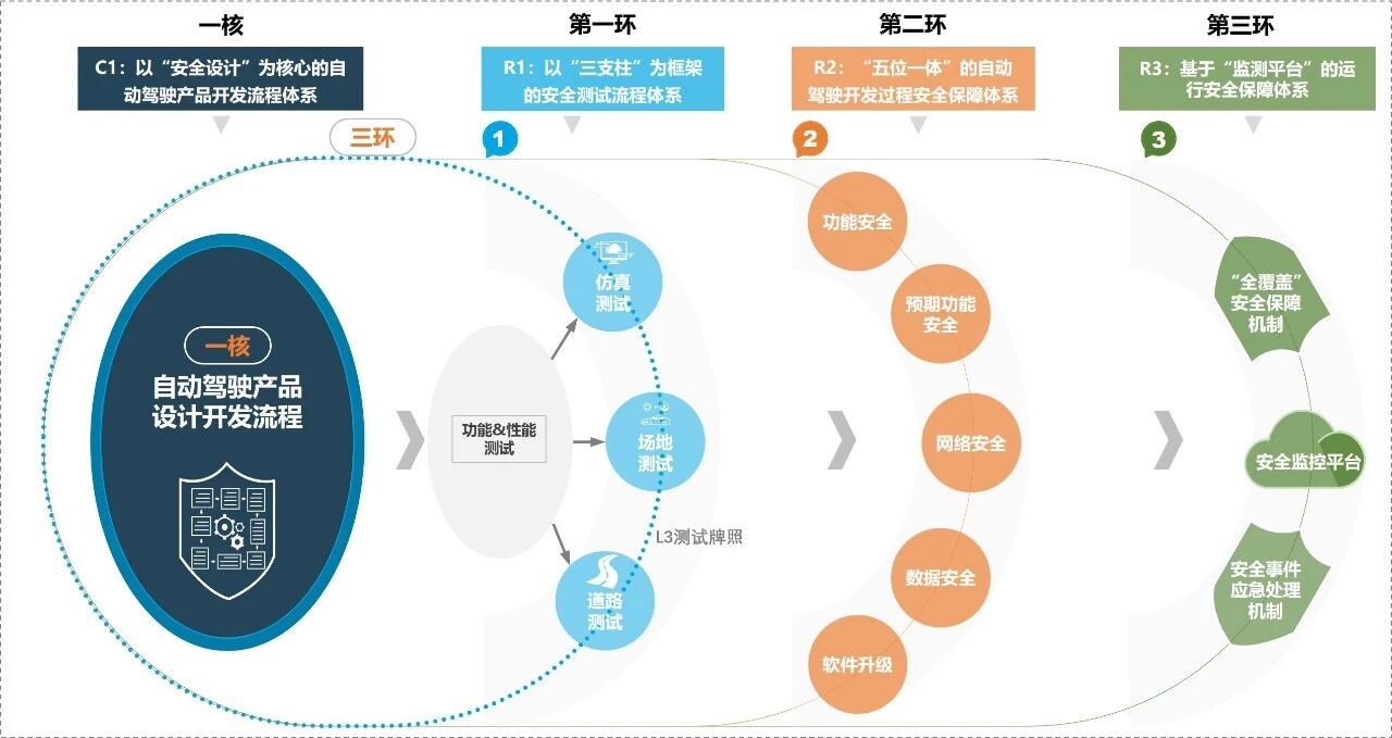 "三环"防护体系则构建起产品全生命周期的安全屏障。测试验证环节通过"仿真测试、封闭场地测试、开放道路测试"三位一体框架,确保自动驾驶系统与真实交通环境的深度适配;过程安全环节打造的"五位一体"保障体系,重点强化了云端、管端、车端的协同防御能力,同时建立覆盖全周期的软件升级管理机制;运行监测环节部署的企业级安全监测平台,可实现7×24小时车辆状态追踪与数据分析,形成"监测-分析-优化"的动态闭环。这种立体化防护机制,使车辆在应对突发状况时具备更强的主动响应能力。
