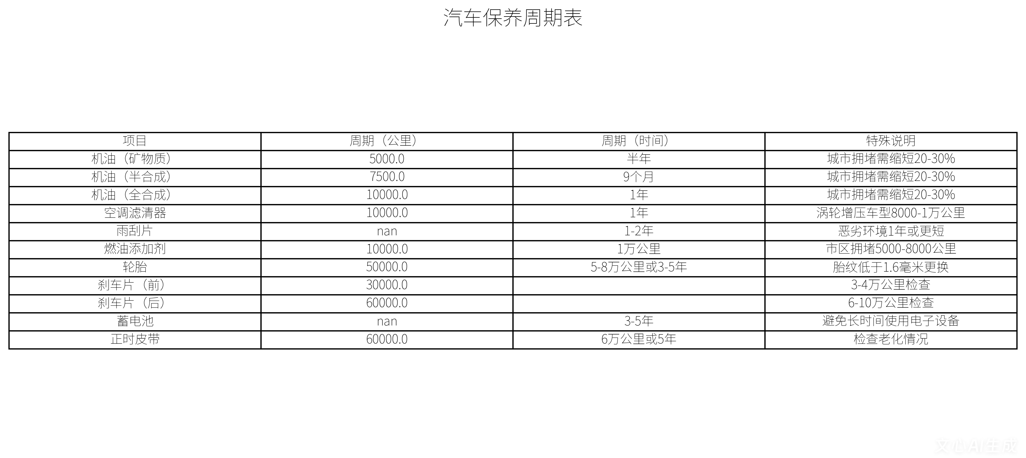 通过数据可视化工具生成《汽车保养周期表》,清晰呈现11类关键部件的保养逻辑: