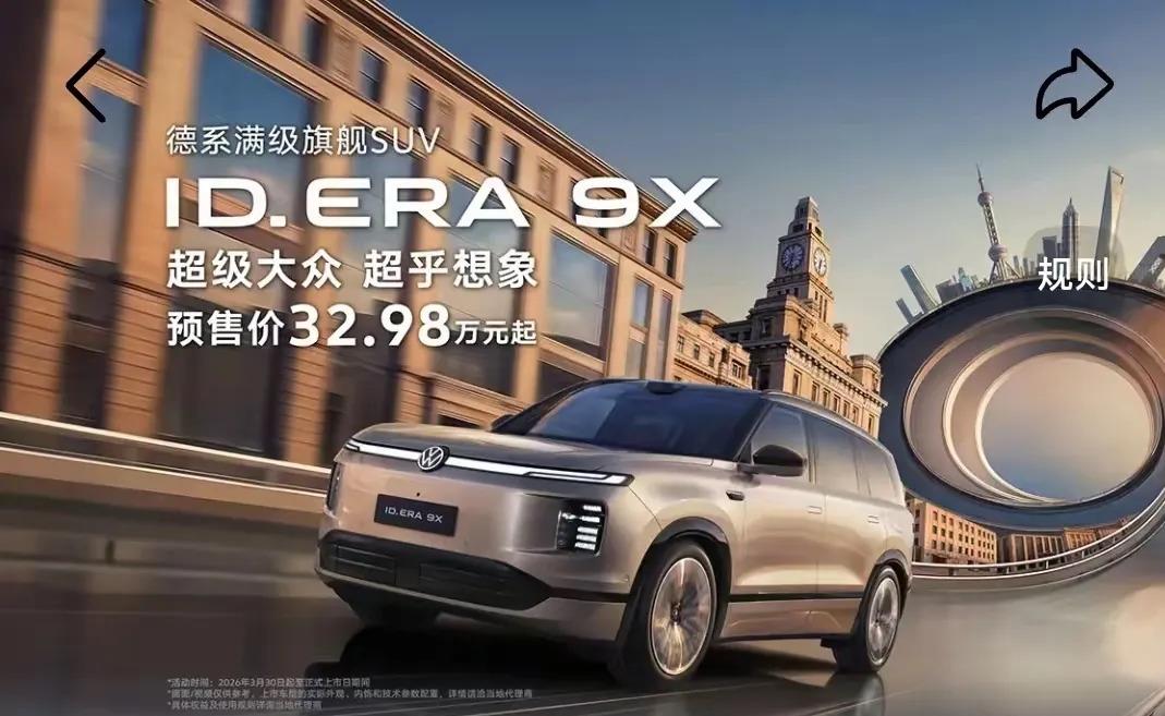 大众这次是真的急了,也真的变了。以前提起大众的电动车,大家第一反应就是ID.系列那几款纯电车,虽然底盘质感没得说,但车机拉胯、配置抠门也是出了名的。可这次ID.ERA 9X完全换了一套打法。它不再端着“德系贵族”的架子搞选装包那一套了,而是直接喊出了“入门即满配”的口号。什么意思呢?就是你买32.98万的最低配,也能享受到副驾零重力座椅、二排的动态零重力座椅、主动后轮转向系统,甚至连高阶智驾都给你终身免费使用。这在以前的大众车上,简直是想都不敢想的事。