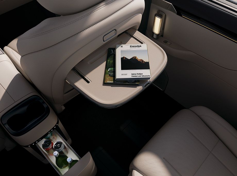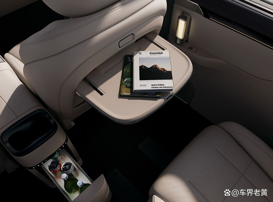 真正让我觉得有意思的是二排:两张带腿托、通风、加热、按摩的独立豪华座椅,可选装17.3英寸多角度悬停折叠娱乐屏,还有智能三温冰箱和小桌板。