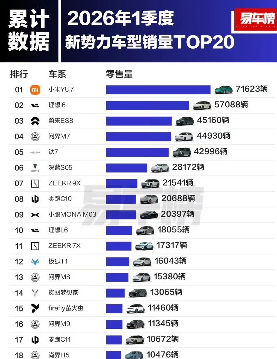 2026年第一季度新势力销量榜出来了,零跑以11.02万辆拿下了冠军,理想9.51万辆排第二,蔚来8.35万辆第三,小米7.86万辆第四。单看这个排名,小米确实不是第一。但你翻翻1月份的数据,小米YU7单月卖了37869辆,直接登顶全国乘用车零售销量总冠军,不分油车电车、不分轿车SUV、不分价格区间,就是第一名。这是什么概念?这是继特斯拉Model Y之后,第二款能做到20万以上单价还能登顶全品类榜首的纯电车。