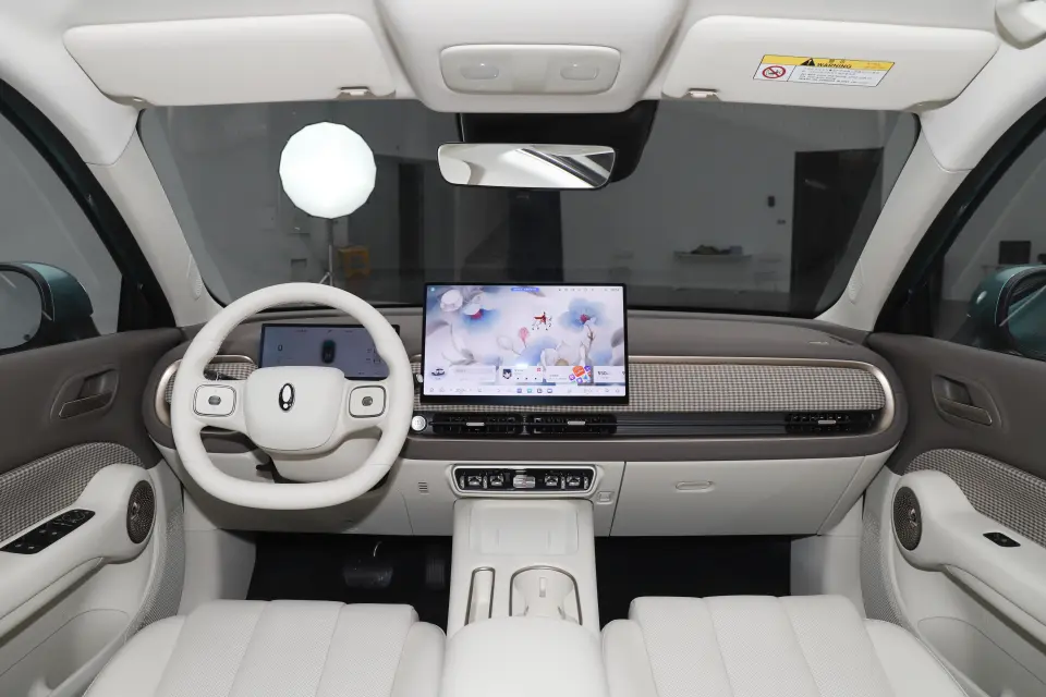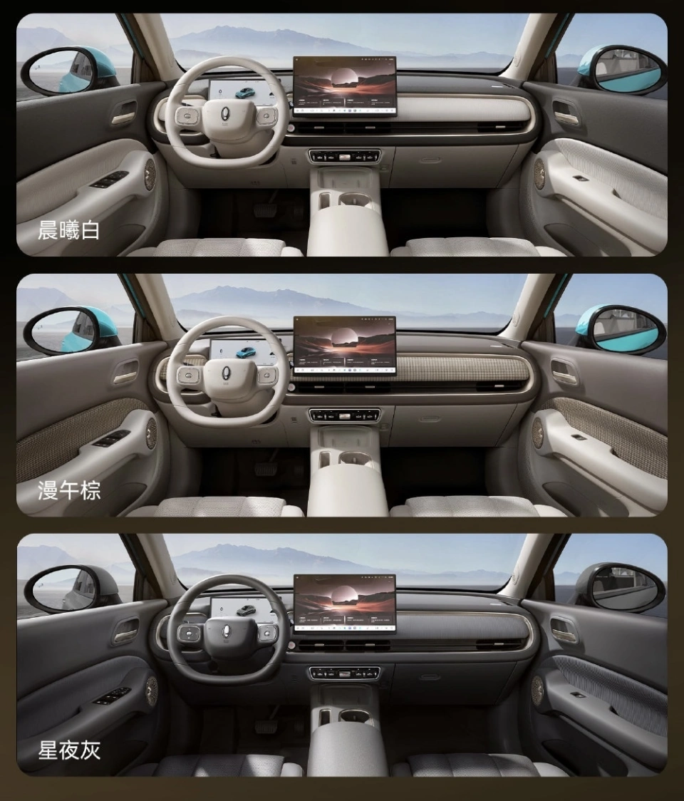 拉开车门,这种“氛围感”差异就更明显了。欧拉5的内饰大胆采用了“留白哲学”和大量的格纹织物面料覆盖,配色叫“晨曦白”、“漫午棕”,名字都像咖啡馆的菜单,追求的是居家般的温馨与精致。
