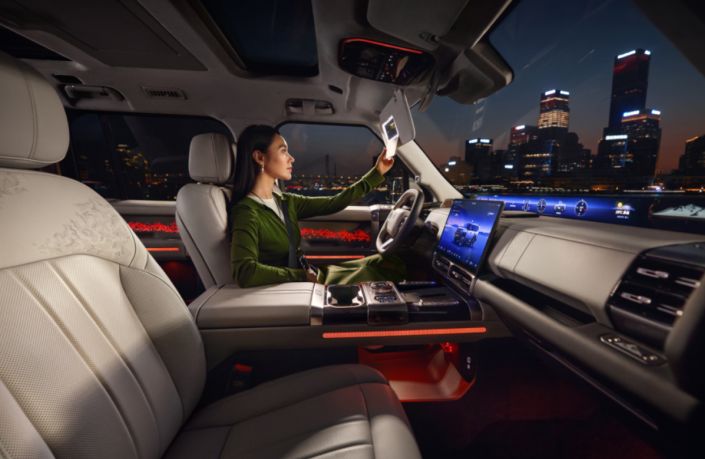 智能化方面,G700采用华为乾崑智驾ADS 4系统,配备27个感知元件,支持“车位到车位”的高阶辅助驾驶功能。车内配备多块大尺寸屏幕,包括35.4英寸的贯穿式天际屏和后排娱乐屏,实现多屏联动。智能空气悬架与CDC阻尼控制系统提升了不同路况下的行驶质感。座椅采用六座独立布局,配备通风、加热、按摩功能,内饰材质选用头层皮料,力求在越野场景中提供接近豪华轿车的乘坐体验。