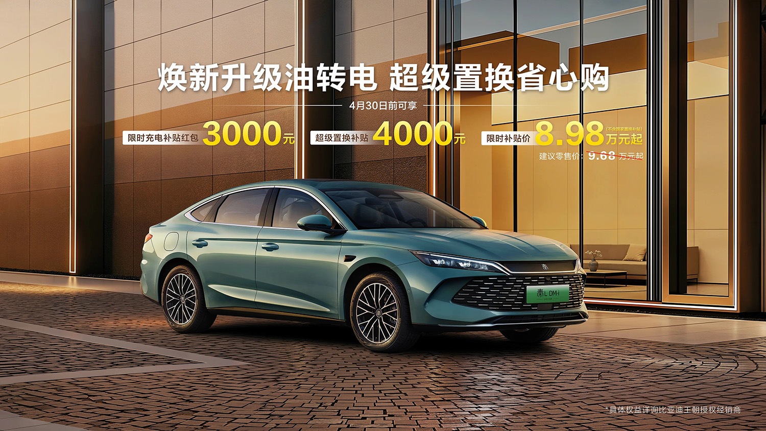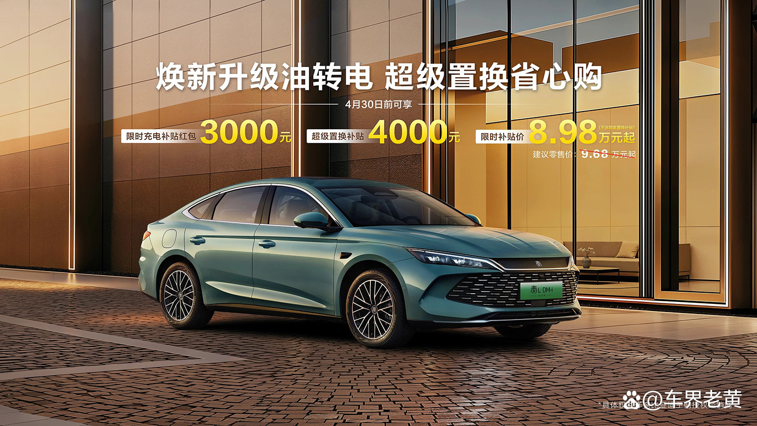 比亚迪秦L DM-i原本指导价9.68万起,这次限时直降7000元,由3000元充电补贴红包加上最高4000元置换补贴拼凑而成。