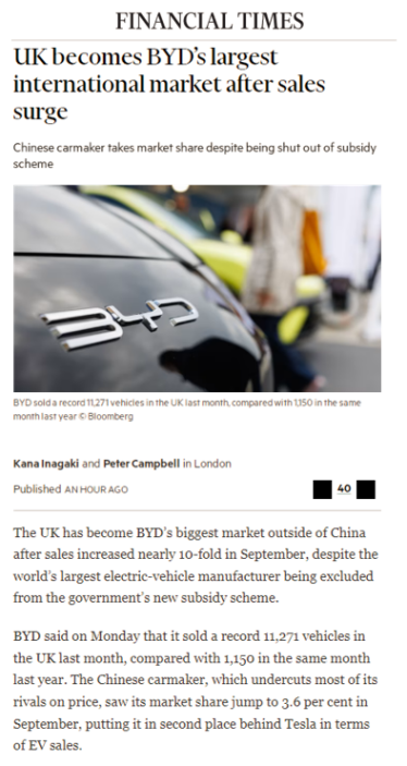 比亚迪在英国市场的高速增长,也吸引了英国主流媒体的高度关注。英国广播公司(BBC)报道“中国电动汽车巨头比亚迪9月英国销量创下新高”。《泰晤士报》则以“中国新晋品牌比亚迪超越英国老牌汽车品牌”为题,指出“两年前英国几乎没人听说过比亚迪”。《金融时报》更进一步强调“英国成为比亚迪最大的国际市场”。