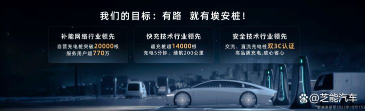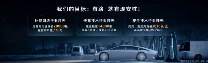补能与服务网络同步完善。截至10月中旬,埃安自营充电桩超2万根,1000V快充桩数量居行业首位,并接入超137万根第三方桩,构建“快、广、近”的补能生态。销售与服务网点正加速向三四线城市下沉,计划2026年扩展至600家,强化全生命周期服务触达。