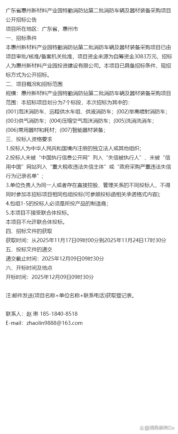 广东省惠州新材料产业园特勤消防站第二批消防车辆及器材装备采购项目公开招标公告