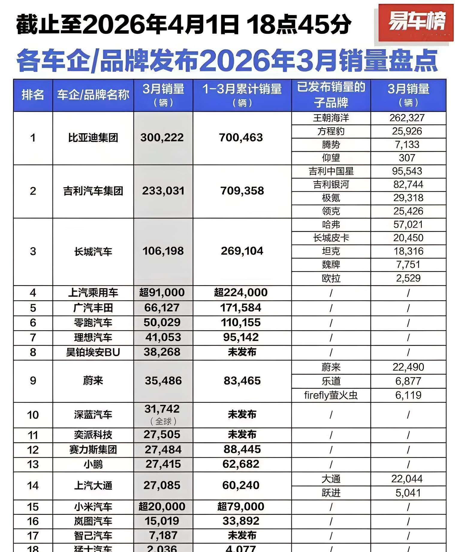 吉利这边,3月233031辆的成绩虽然被长安超了,但一季度累计709358辆,仍然是今年累计销量的第一。银河、领克、极氪三大品牌协同发力,新能源占比已经达到55%。吉利的打法是不把鸡蛋放在一个篮子里,燃油车和新能源两条腿走路,短期内可能没那么炸眼,但抗风险能力确实强。