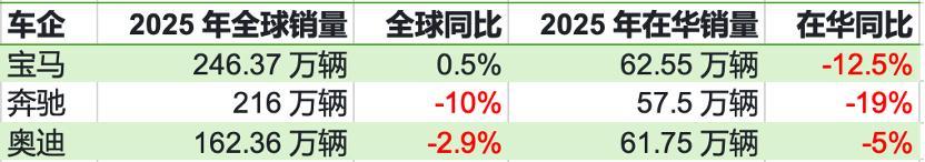 如果拿它们三家去年全年销量的总和,与2024年数据对比的话,就可以看到BBA家族2025年在华比2024年要少卖了26万辆。
