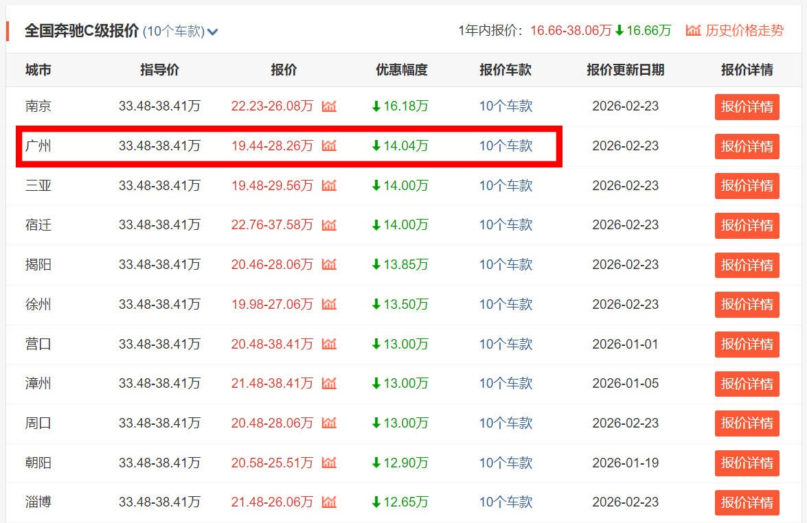 也是没想到,这个春节假期一过完,像奔驰C级这样的老牌豪华燃油车就大降价了。就拿给出了全国最低报价的广州来说,奔驰C级报价19.44-28.26万元,优惠幅度高达14.04万。
