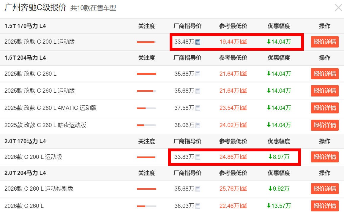 至于为什么要清库存,主要也是为了给新上市不久的2026款(2.0T)奔驰C级车型让路。毕竟,2026款车型全系都搭载了2.0T发动机,而此前的2025款车型则还是配备的1.5T发动机。