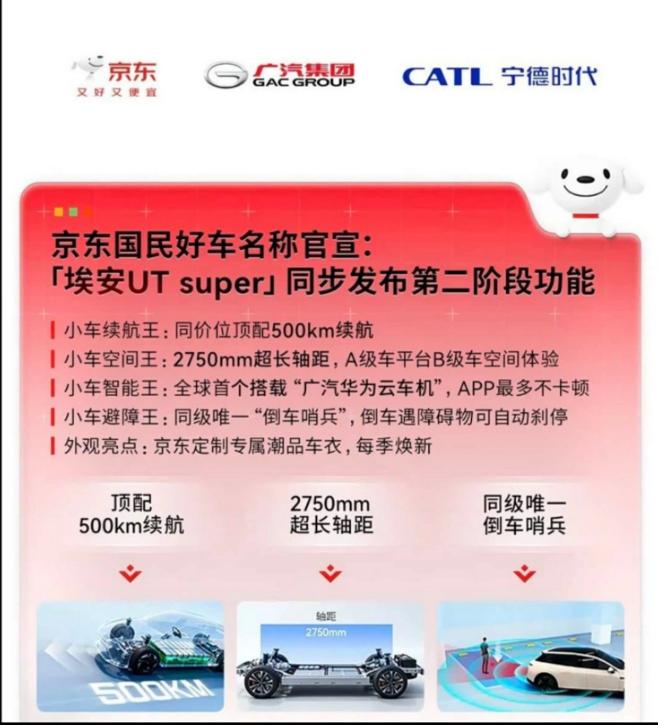10月23日,京东推出的“国民好车”车型名称正式官宣——埃安UT super。这回京东联手广汽和宁德时代,整了个大活儿!"国民好车"埃安UT super正式官宣了。这阵势,简直就是"电商巨头+老牌车企+电池大佬"的顶配组合,明摆着是要在10万以内的纯电小车市场搅个天翻地覆啊。隔壁那位销量不错的吉利星愿,可得打起精神了。