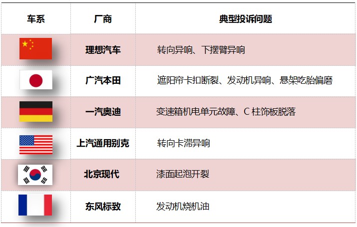 9月份,理想汽车的投诉声量大幅下降,但仍是投诉集中度最高的中国品牌,L系列投诉集中度仍然很高。广汽本田依然是日系车的重点投诉对象。皓影遮阳帘卡扣断裂、飞度发动机异响、雅阁悬架吃胎偏磨都是车主的“心病”。奥迪是德系车投诉问题的重点对象,变速箱机电单元故障和C柱外饰板脱落问题都较为集中。美系车代表是上汽通用别克,英朗转向卡滞异响再次抬头。