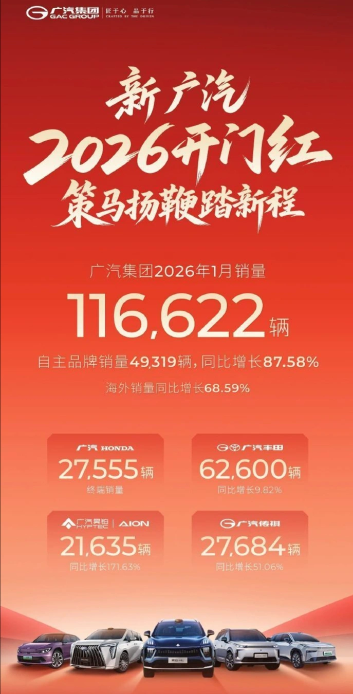 广汽集团 116622辆,其中:自主品牌49319辆,同比增长87.58% ;广汽本田 27555辆,广汽丰田62600辆,广汽传祺 27684辆,昊铂 21635辆。