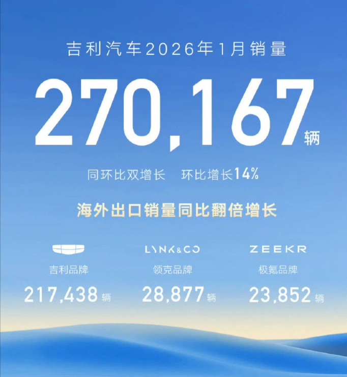 吉利 270167辆,同比增长14% ;其中:吉利品牌217438辆,极氪 23852辆,同比增长99.7% ,领克 28877辆,领克新能源同比增长12% ;