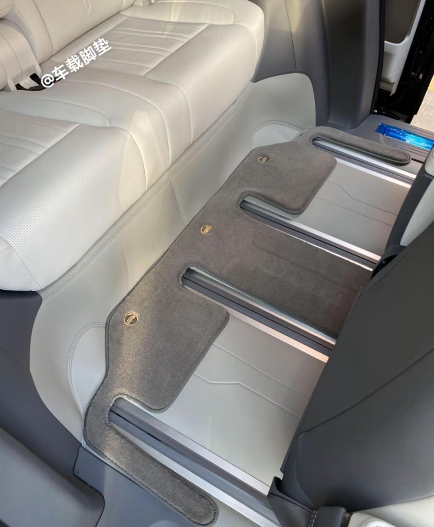 先说不卡滑轨这事儿。极氪009的二排座椅移动范围特别大,要是脚垫没装好或者设计不合理,座椅前后移动的时候就会蹭到、卡住,甚至把脚垫卷起来。我之前开朋友的商务车就遇到过这情况,特尴尬。这套软包因为是嵌入式的,完全贴着车底走,滑轨上面干干净净,座椅随便移动,一点阻力都没有。