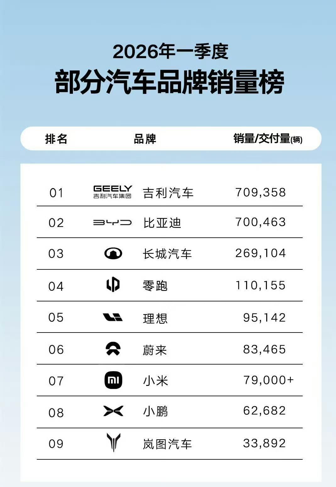 这话可不是我瞎说的。一季度销量数据一出来,汽车圈直接炸了锅。吉利汽车以70.9万辆的成绩,硬生生把比亚迪从坐了四年的“自主一哥”宝座上拉了下来。要知道,2025年全年,比亚迪甩开吉利的差距可是接近158万辆啊,平均每个月要多卖13万辆。这才过了三个月,局面就彻底翻过来了,吉利只用了不到9000辆的微弱优势,上演了一场漂亮的“复仇记”。