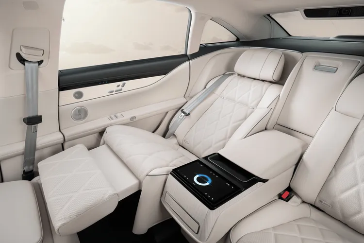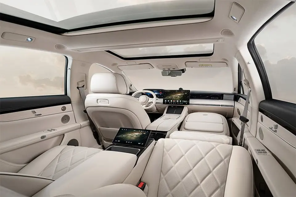 再加上新换的造型尾灯和轮辋,整个车的气场直接提升一个档次,既保留了旗舰轿车的稳重,又不失年轻化的个性,比比亚迪汉的传统设计更有记忆点,也比蔚来ET5的运动风更适合商务场景。车身尺寸达到5160×1987×1486毫米,轴距3050毫米,比同级竞品足足大一圈,搭配承载式车身和可自动调节的空气悬挂,开着稳、坐着舒服,不管是家用还是商务接待都有面儿。