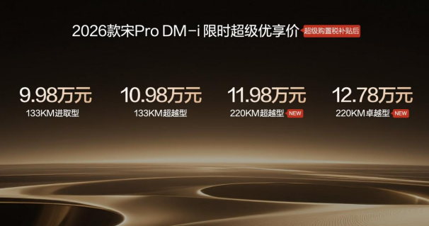 2026年1月10日,比亚迪2026款宋ProDM-i长续航220km版本正式上市,全系限时价9.98-12.78万元。